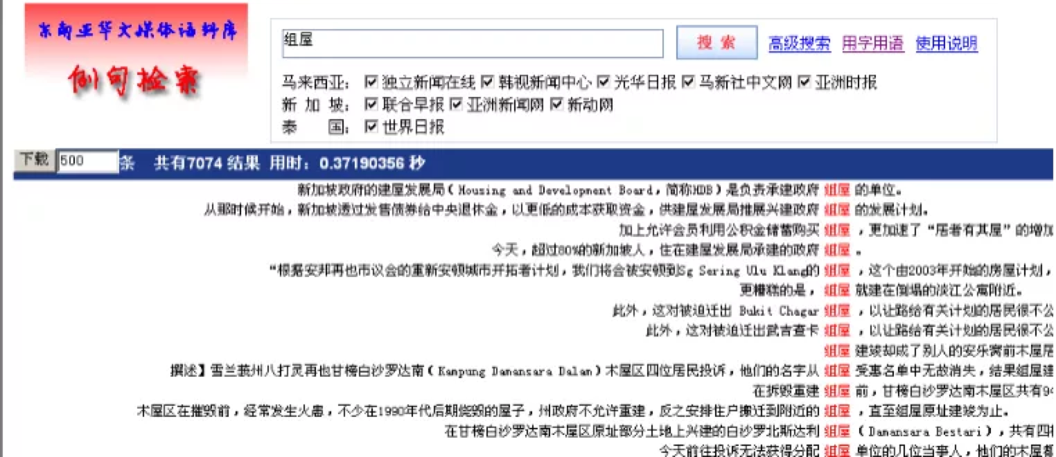 Schematic diagram of example sentence retrieval with single keyword in Southeast Asian Chinese Language Media Corpus