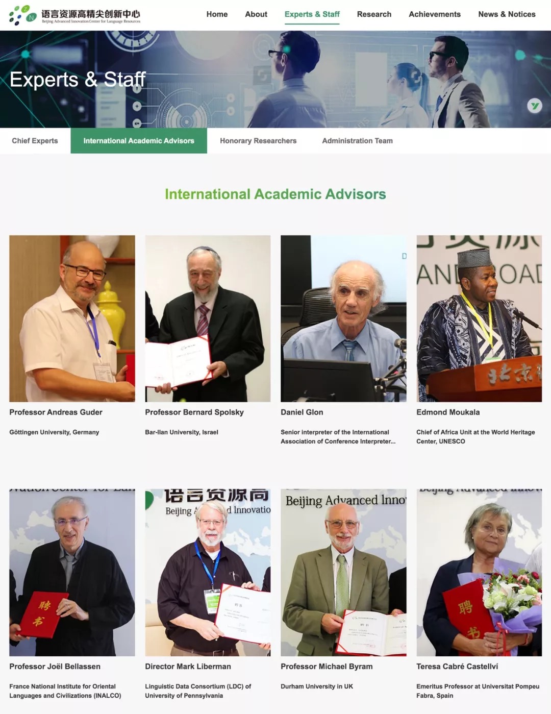 Under the Experts & Staff, there are four sub-columns, Chief Experts, International Academic Advisors, Honorary Researchers,and Administration Team. So far, ACLR has brought together 8 international academic advisors.