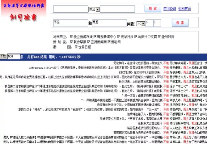东南亚华文媒体语料库单个关键词例句检索示意图