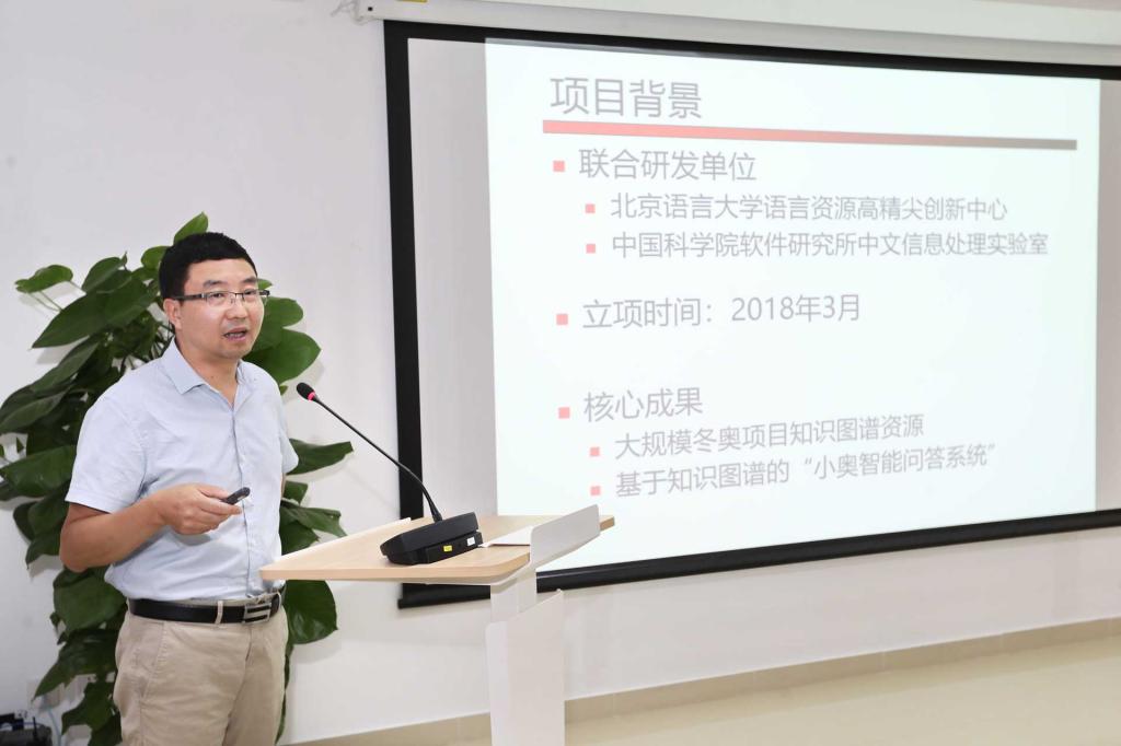 会上,项目负责人、中心特聘研究员、中国科学院软件研究所孙乐研究员详细介绍了“基于知识图谱的北京冬奥项目智能问答系统”的研发进展及成果特色,指出项目构建了大规模知识图谱,完整覆盖5类冬奥核心实体并设计了多种类型的知识展示服务,研发了语音和文字两种输入方式的“智能问答平台”,提供实时便捷的冬奥会问答服务,为普及冬奥知识、宣传冬奥文化提供了全方位、立体化手段。杨尔弘教授指出,中心借助北京市教委“高精尖计划”,汇聚了一批高层次专家,打造科研创新平台,集中展示语言资源领域最新研究动向和创新成果,在“尊重科学、尊重科学家、尊重科学家的劳动”理念指引下,积极服务国家和北京市重大发展战略。