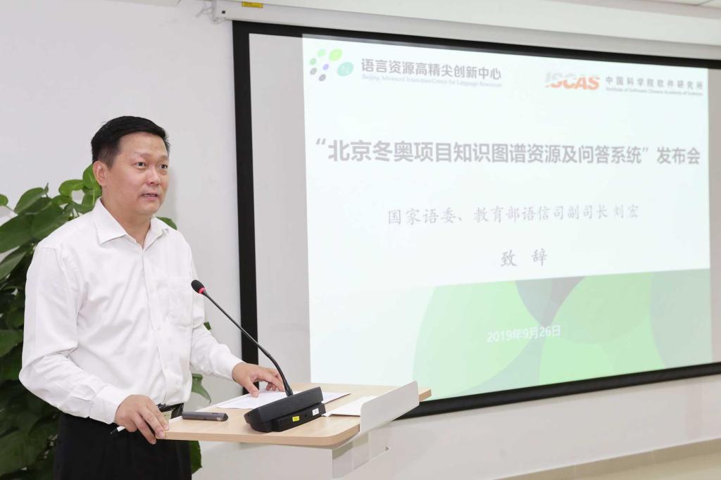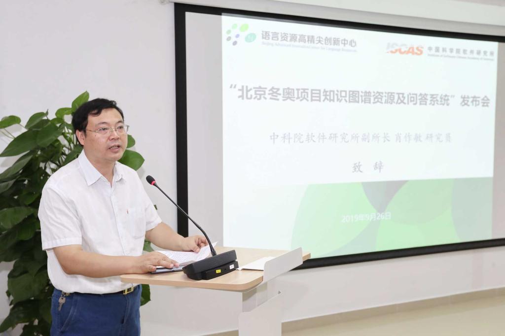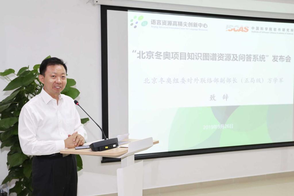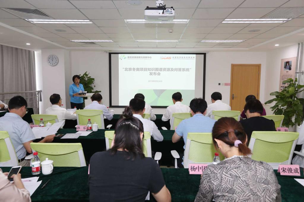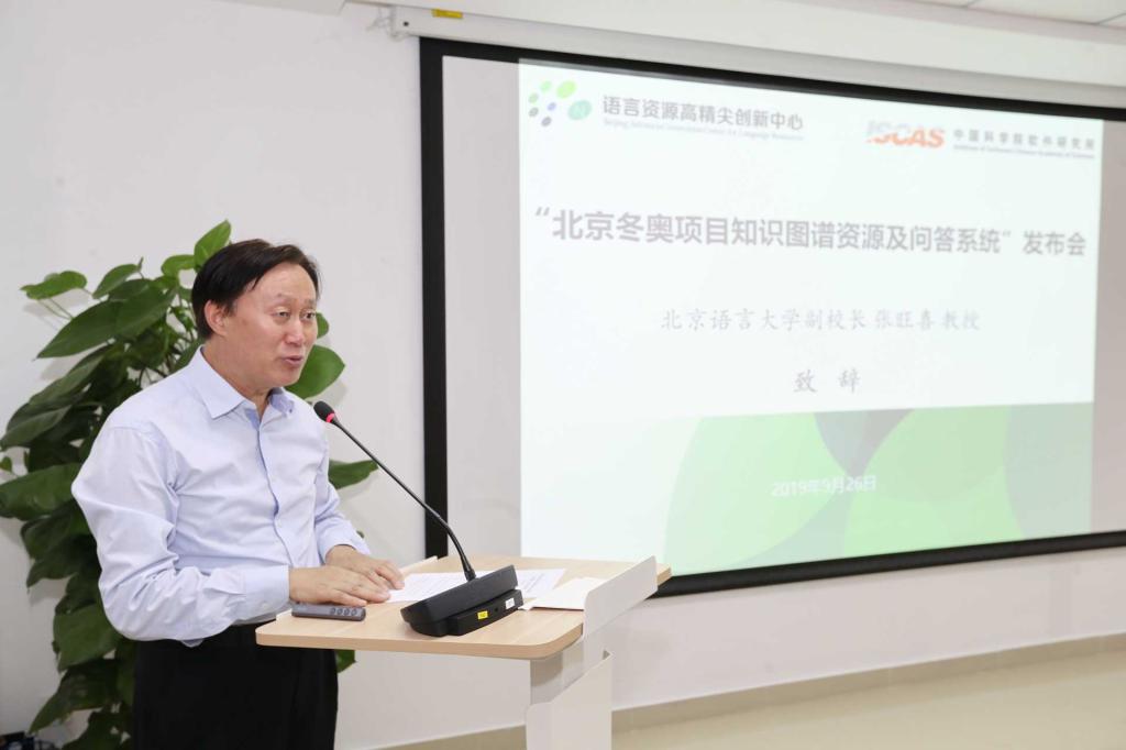 2019年9月26日上午,“北京冬奥项目知识图谱资源及问答系统”发布会在北京语言大学举行。北京冬奥组委对外联络部副部长万学军、教育部语信司副司长刘宏、北京语言大学副校长张旺喜、中科院软件研究所副所长肖作敏、北京冬奥组委延庆运行中心副主任张双锁等领导及专家出席发布会。语言资源高精尖创新中心(以下简称“中心”)常务副主任杨尔弘教授主持发布会。
