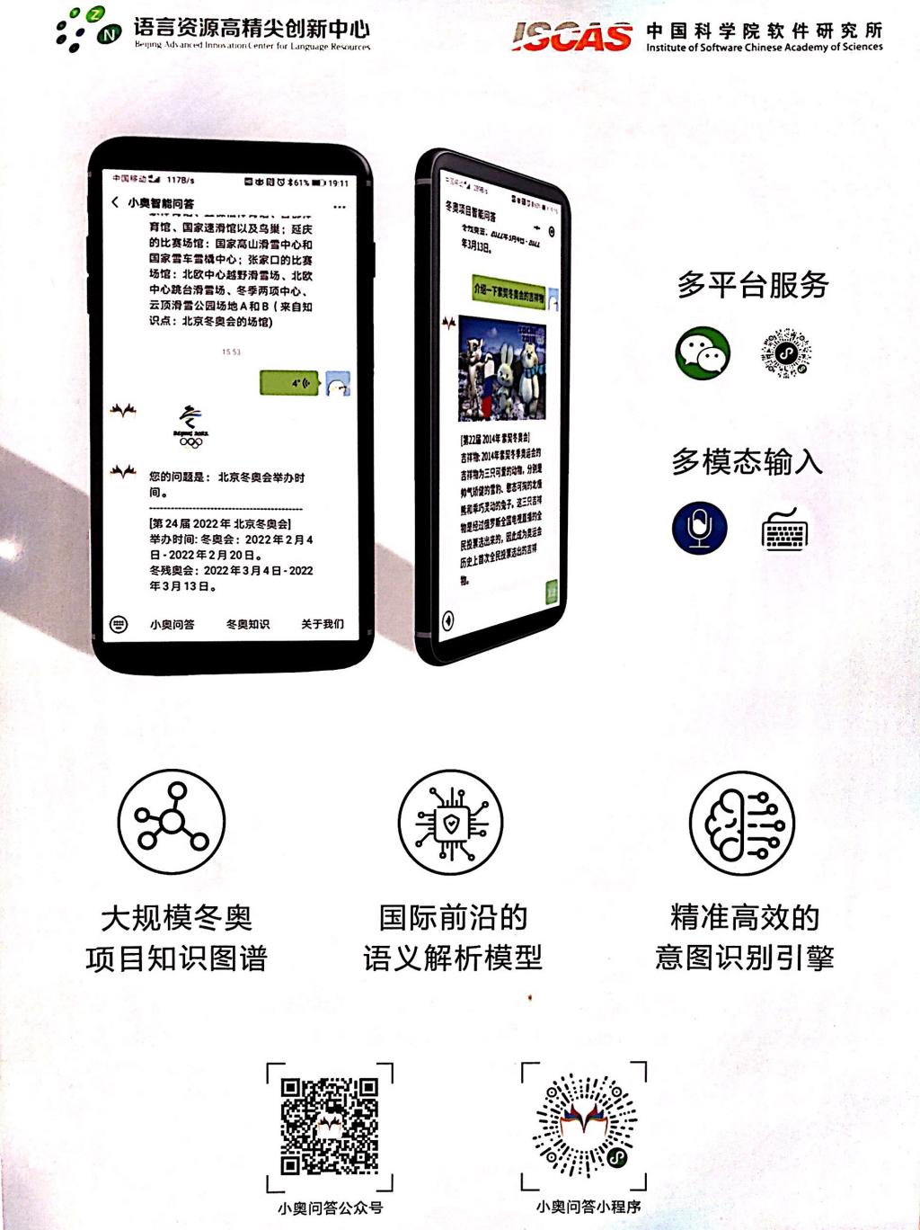 当前最常用的搜素引擎大多采用关键字匹配,缺乏对语言的理解,导致结果不够精准,往往需要用户进行二次筛选。针对该问题,项目组基于大规模冬奥项目知识图谱研发了“小奥智能问答系统”。系统采用自主研发的国际前沿深度学习语义解析模型,构建了精准的问句分析引擎。“小奥智能问答系统”以微信公众号和小程序的方式提供服务,接受文本和语音两种方式的问句输入。