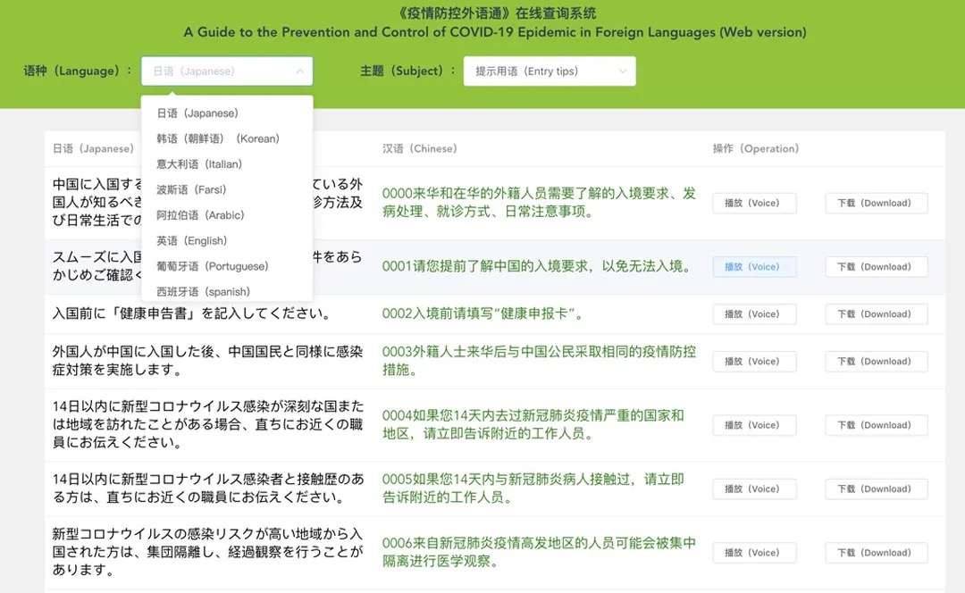 为使新冠肺炎疫情期间在华和来华的留学生和外籍人士及时了解有关信息,减少沟通障碍,在教育部、国家语委的支持指导下,“战疫语言服务团”紧急研发了《疫情防控外语通》,包括阿拉伯语、阿姆哈拉语、阿塞拜疆语、波斯语、德语、俄语、法语、韩语/朝鲜语、豪萨语、加泰罗尼亚语、柬埔寨语、老挝语、蒙古语、马来语、葡萄牙语、日语、斯瓦希里语、泰语、土耳其语、西班牙语、希腊语、意大利语、英语、印尼语、越南语等多个语种与中文对照版本。