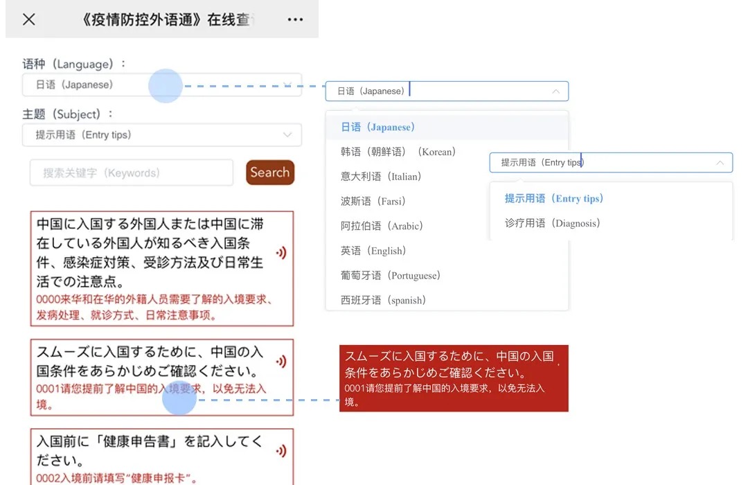 《疫情防控外语通》可根据不同需求灵活组合内容,可供医疗机构、教育机构、机场港口、航空公司、外交外事机构、海关、社区管理部门使用,也可以直接提供给留学生和外籍人士使用。
