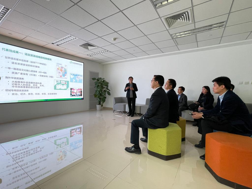2021年3月31日下午,北京外国语大学校长杨丹、副校长赵刚、党办校办主任汤哲远、孔院处处长金利民一行到语言资源高精尖创新中心参观调研。北京语言大学校长、中心主任刘利、校办主任李志坚、中心常务副主任杨尔弘、中心副主任刘晓海、中心特聘研究员傅兴尚陪同调研。
