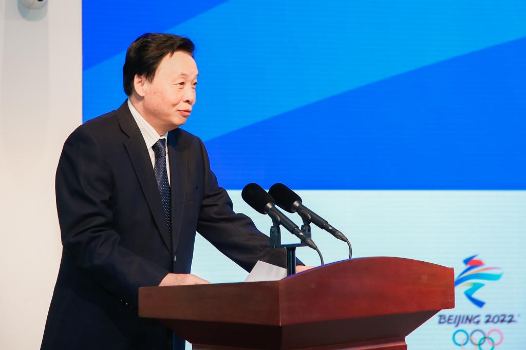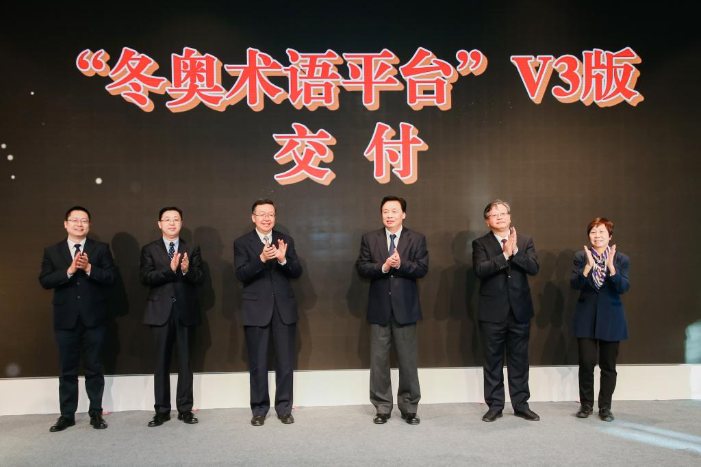 田学军副部长、杨树安主席、刘利校长、顾青书记、裴亚军主任、刘和平教授共同启动冬奥术语平台V3版