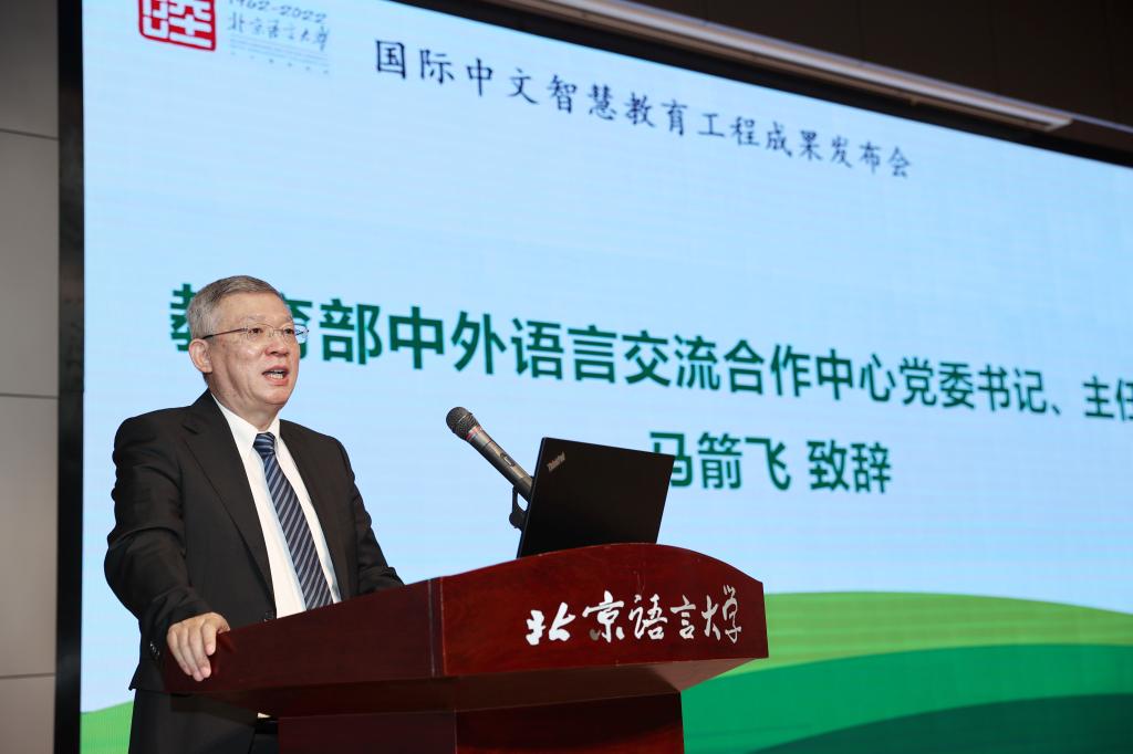 马箭飞代表教育部语合中心向北京语言大学国际中文智慧教育平台1.0版的成功发布以及北京语言大学即将迎来建校六十周年校庆表示热烈祝贺,他指出北京语言大学在国际中文教育事业发展的每一个重要历史阶段都发挥着重要的引领示范作用,国际中文智慧教学平台的发布体现了北语发挥优势服务国际中文教育事业的主动担当,是国际中文教育信息化建设进程的又一项标志性成果,势必会产生重要影响。他介绍了语合中心在国际中文在线教育顶层规划设计、规范标准研制、平台体系搭建、优质资源建设等方面开展的工作,并表示语合中心将同北京语言大学、其他院校、社会各界一道,按照应用为王、服务至上、示范引领、安全运行的工作要求,建立健全国际中文在线教育标准,持续大力支持国际中文教育智慧教室教学建设,实现国际中文在线教学的资源共享,以此加快推进实施教育数字化战略,推动构建人类命运共同体!